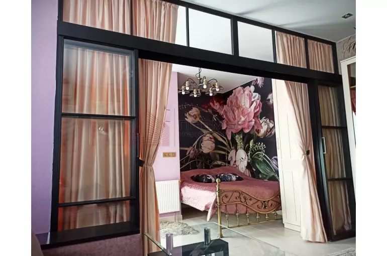 * *и отдельная спальная зона* за дизайнерской раздвижной перегородкой.